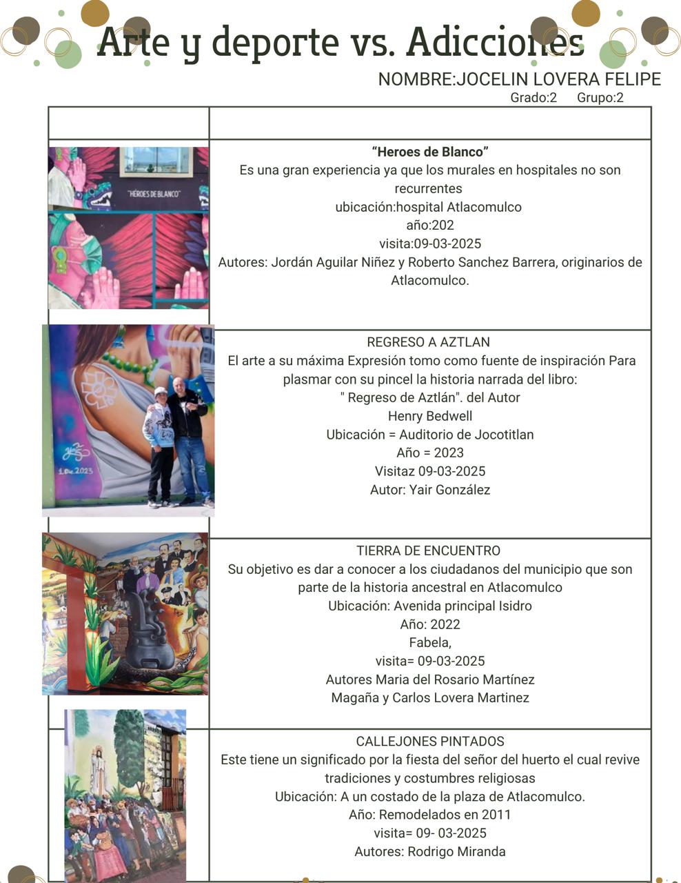 La química en los colores de los murales de mi región...los colores en los murales provienen de pigmentos capaces de absorber y reflejar ciertas longitudes de ondas de luz. La estabilidad química de los pigmentos influye en cuanto tiempo los colores se mantienen vivos sin desvanecerse y la composición química del pigmento interactúa con la superficie del mural y los agentes ambientales cómo lo son: la humedad,la contaminación entré otros. La química desempeña un papel fundamental en los murales,ya que influye en la composición, durabilidad y apariencia de los materiales utilizados.
